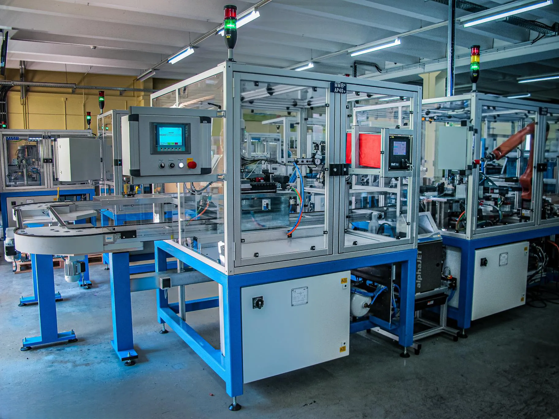 - Ein verkettetes Montagesystem von verschiedenen einzelnen Stationen, die durch ein Bandsystem verknüpft sind.